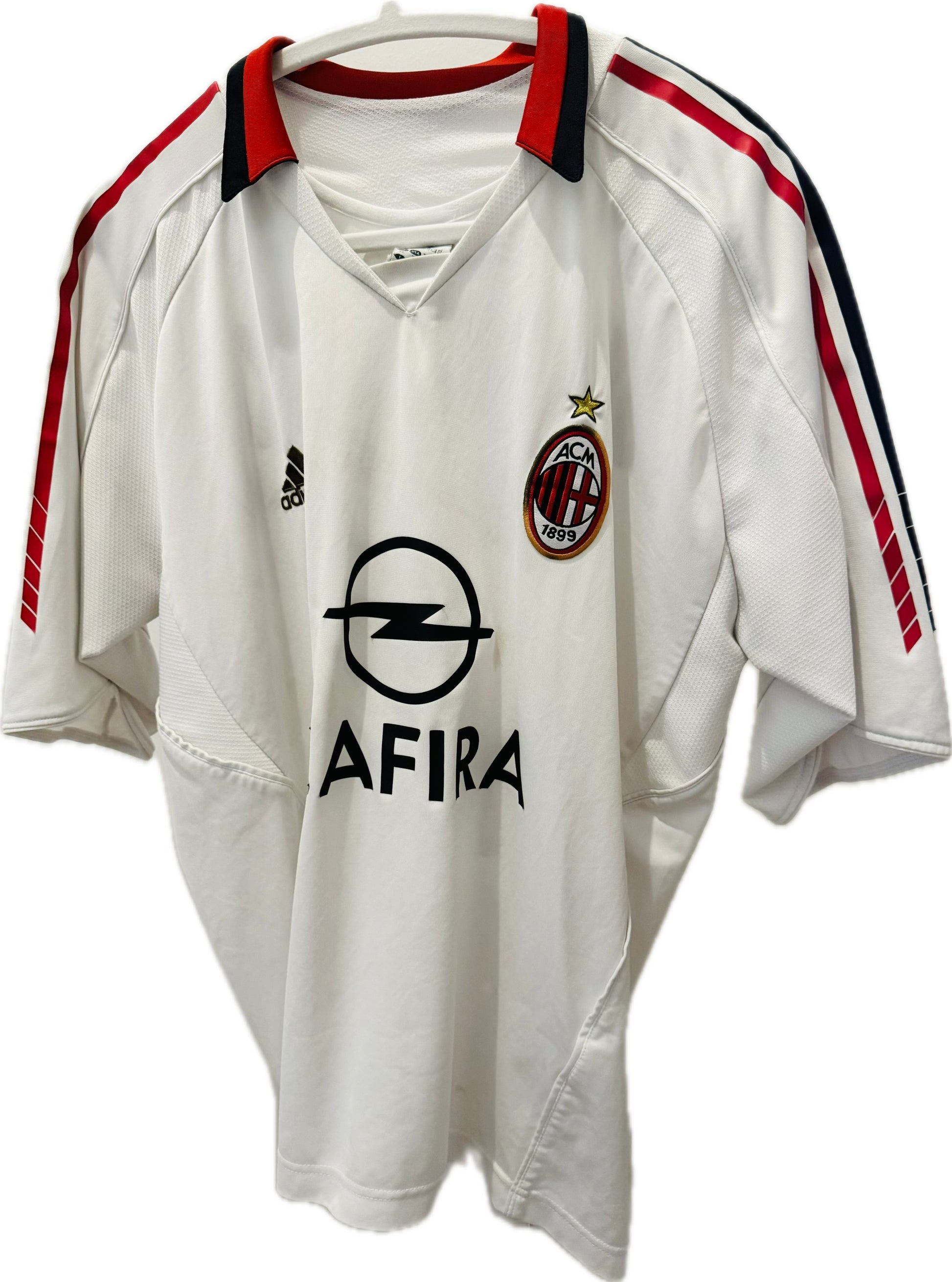 - Classic white away kit with red & black trim on the collar and sleeves.