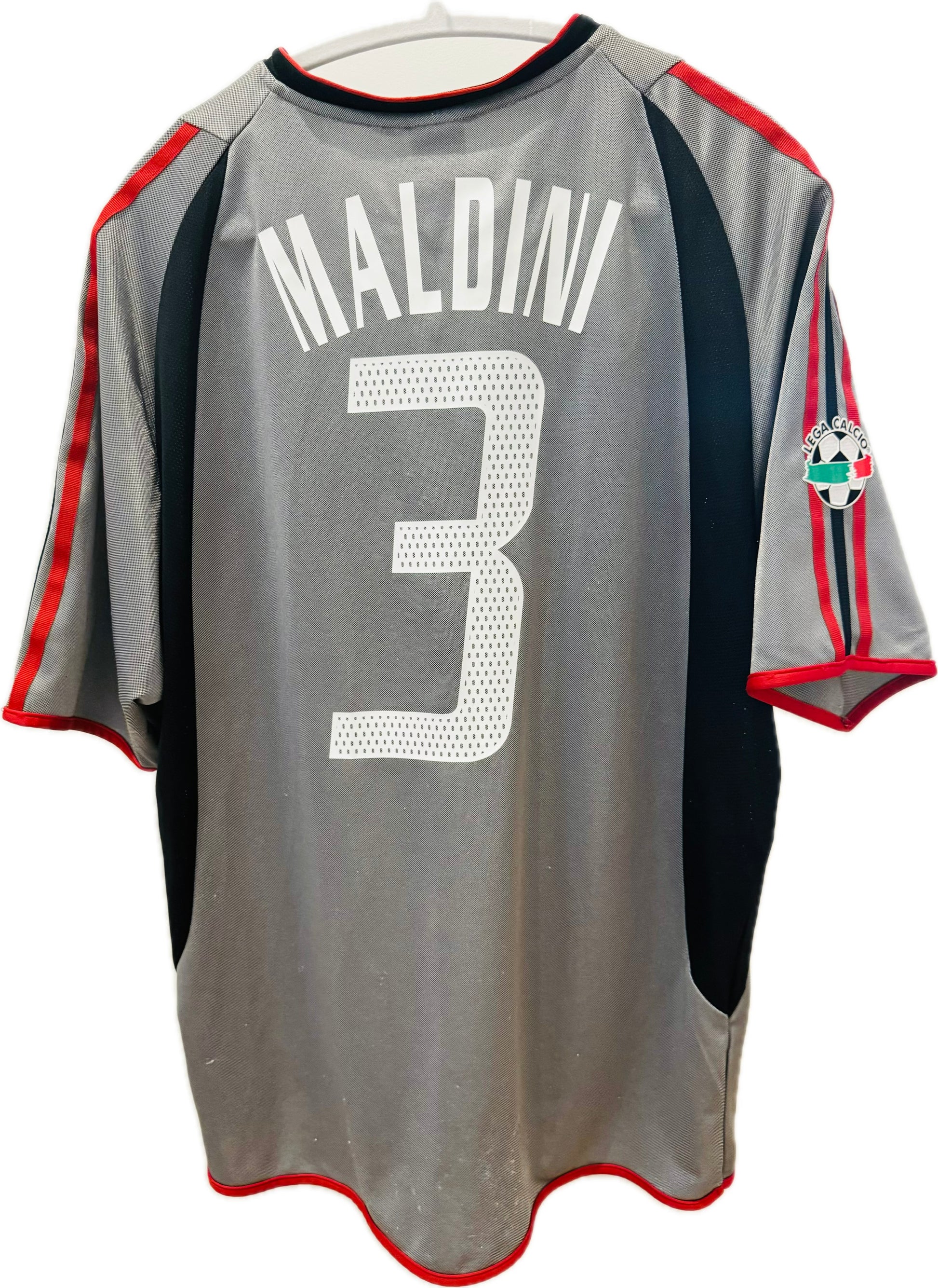 - Details: Features “Lega Calcio” Serie A patch on the sleeve, classic Adidas 3-stripes in red, and Maldini’s name and number in perforated lettering on the back.