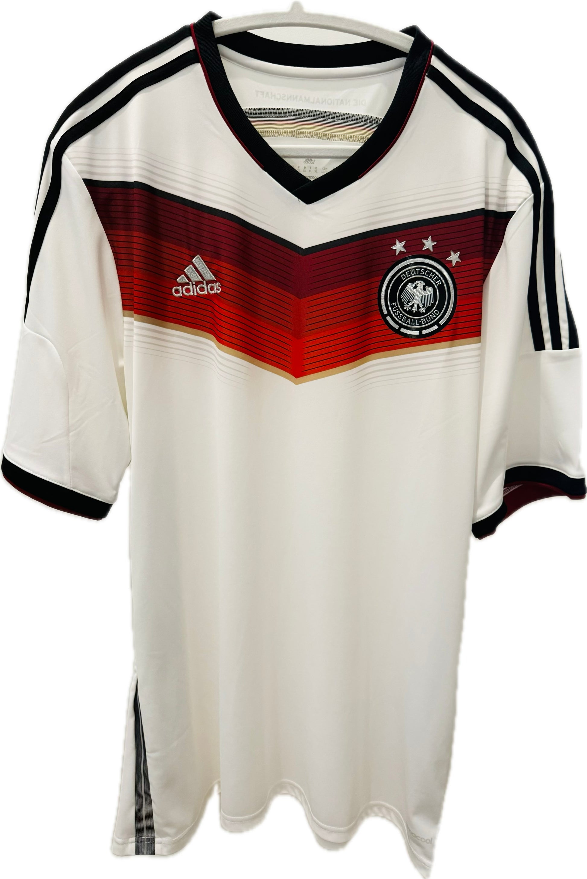 - Badge: Deutscher Fußball-Bund (DFB) crest with 3 stars, representing Germany’s three World Cup wins up to that point. (A fourth star was added after winning the 2014 World Cup in Brazil.)